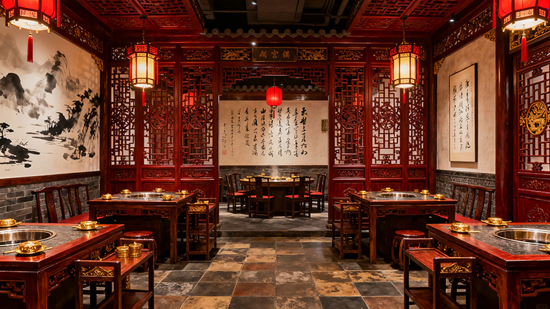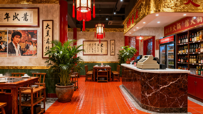 以紅色和金色為主色調(diào),紅色大面積應(yīng)用于柱子、燈籠和地面瓷磚,營造出熱烈、喜慶的氛圍,契合火鍋熱鬧的用餐場景;金色作為裝飾線條和天花板圖案的顏色,提升了空間的華麗感與檔次。通過傳統(tǒng)字畫、復(fù)古海報、中式燈籠等元素,營造出濃厚的復(fù)古懷,讓顧客仿佛置身于過去的時光,增添用餐的趣味性和體驗(yàn)感。