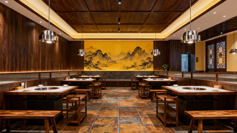 圖三是這張火鍋店裝修效果圖呈現(xiàn)出一種典雅且富有文化底蘊(yùn)的中式風(fēng)格。整體以暖黃色調(diào)為主,墻面大幅的山水壁畫為明亮的黃色,搭配木質(zhì)材料的深棕色,營造出溫暖、舒適且極具傳統(tǒng)韻味的氛圍。這種色調(diào)組合讓人感覺親切,適合火鍋店熱鬧、融洽的用餐場景。