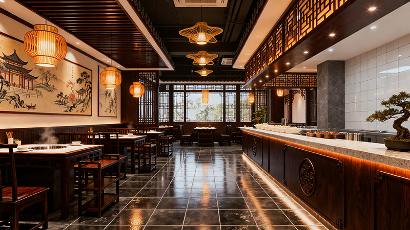 整體空間呈現(xiàn)出對稱的結(jié)構(gòu),桌椅整齊排列,給人以規(guī)整、有序的感覺。這種布局方式不僅符合中式傳統(tǒng)美學(xué),還能提高空間利用率,方便顧客就座和服務(wù)員服務(wù)。